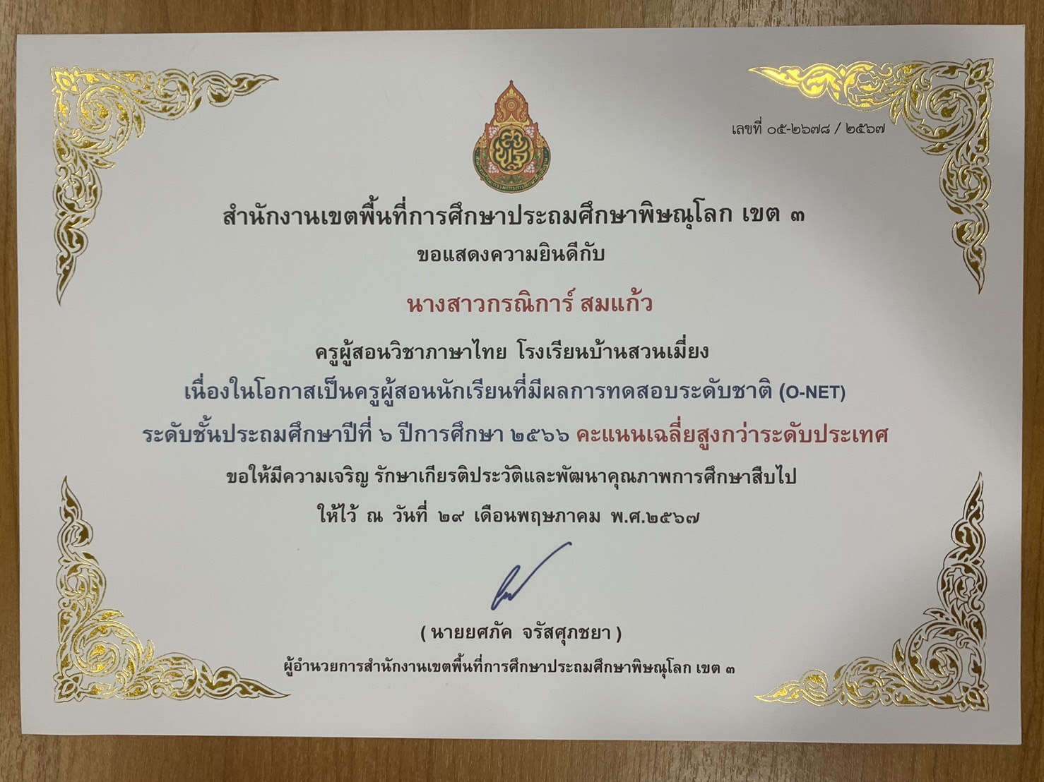 ชื่อผลงาน : ครูผู้สอนนักเรียนที่มีผลการทดสอบระดับชาติ (O-NET) ระดับชั้นประถมศึกษาปีที่ 6 ปีการศึกษา 2566 วิชาภาษาไทย คะแนนเฉลี่ยสูงกว่าระดับประเทศ