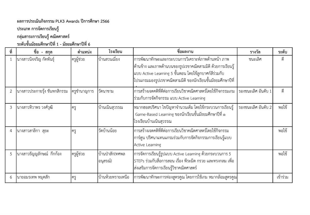 การประเมินกิจกรรม PLK3 AWARDS กลุ่มสาระการเรียนรู้คณิตศาสตร์